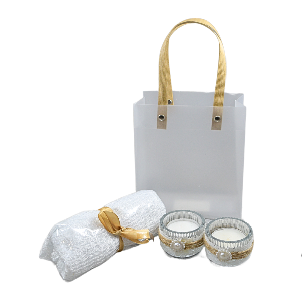 מארז של זוג פמוטים מזכוכית מעוצבים, זוג נרות , ומטפחת ראש יוקרתית ארוזים בשקית שקופה עם ידית , מתנה מושלמת לחלוקה לאורחים באירועי הפרשת חלה ,מקווה, שבת חתן.